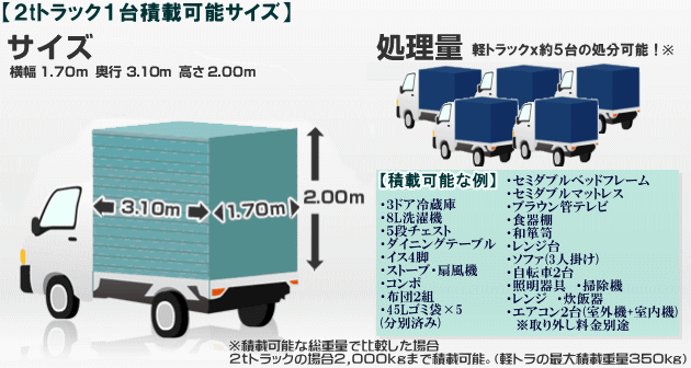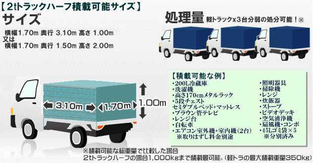 (軽トラ最大積載重量350kg・2トントラックハーフ最大積載可能量1000kg)