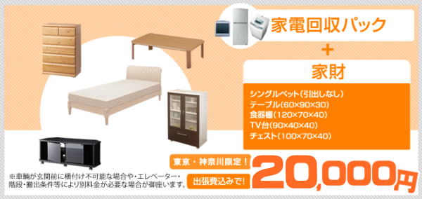 【家具+リサイクル家電3点+小物家電処分】 家電と家具まとめてお得に処分パック料金(税込み) 20,000円 |